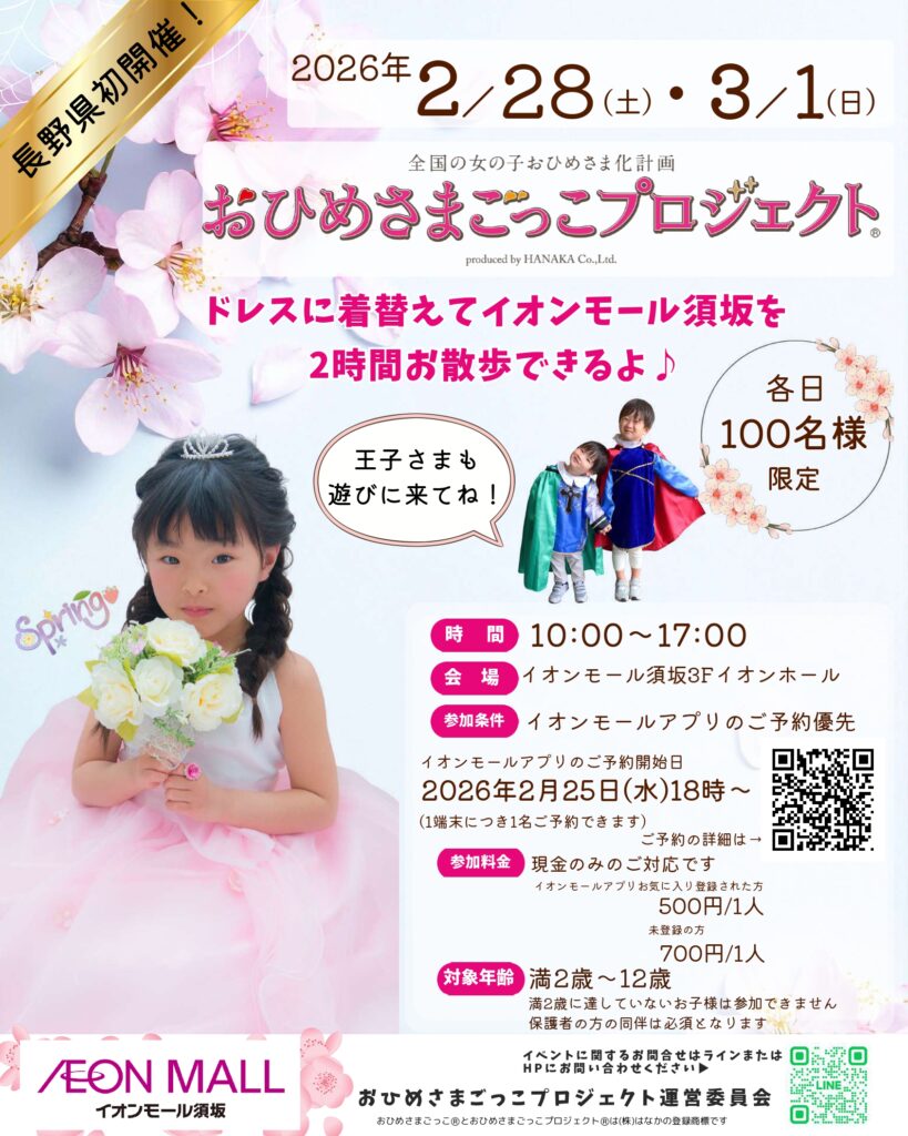 長野県初開催!イオンモール須坂で、おひめさまごっこプロジェクト(R) 開催決定!おひめさま・王子さまにドレスアップ